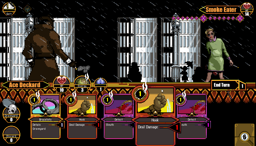 Ace Detective is a deckbuilding card battler set in a noir-styled world of jaded detectives and hardened crime lords. Uncover clues as you exchange blows with a wide variety of criminal adversaries, all done via your trusty deck of cards.